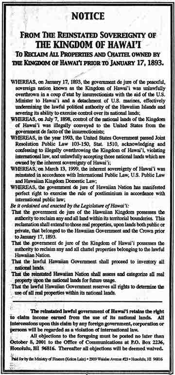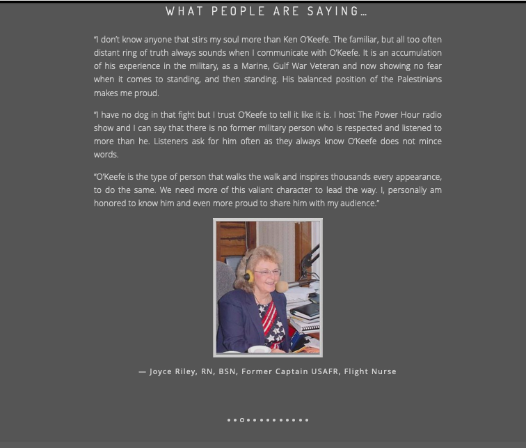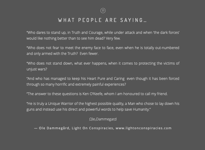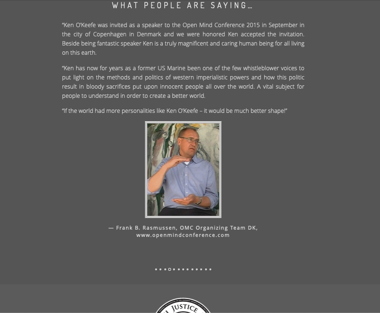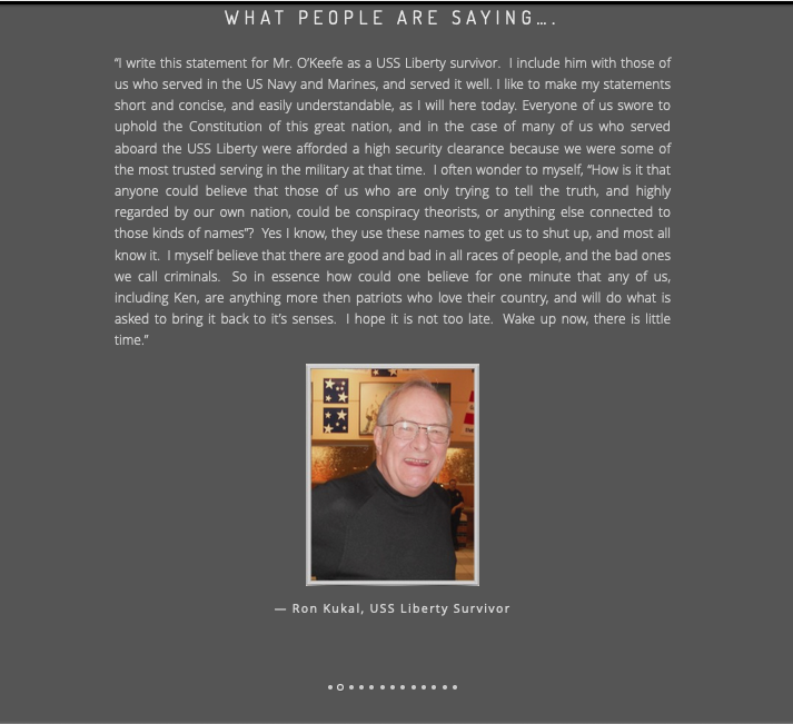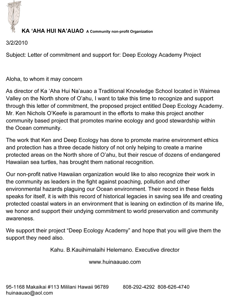 Ken Nichols Brander the ‘Ecopreneur’ for Deep Ecology Hawaii Marine Conservation by Skin Diver Magazine (1999)Captain Paul Watson Sea Shepherd Conservation Society (SSCS) Endorsement for Ken Nichols United States Coast Guard Captains License (1999)Ken Nichols Front Page Seattle Post Intelligencer Sea Shepherd Conservation Society Crew Makah Indian Reservation, SSCS & Greenpeace Co-Founder Captain Paul Watson (1998)Senator Robert Bunda (Hawaii) Endorsement for Ken Nichols, Aqua Magazine Pacific Ecotourism Award (1999)Pupukea Marine Life Conservation District (MLCD) – ‘Shark’s Cove & Three Tables – A Marine Sanctuary in Deep Ecology’s backyard on the North Shore of Oahu (2004)Kahu Butch Kauihimalaihi Helemano, Executive Director ‘Ka ‘Aha Hui Na’auao Traditional Knowledge School Waimea Bay, North Shore of Oahu, Hawaii (2010)Ken O’Keefe (Founder) Trade Not Aid/Aloha Palestine CIC Feature Article ‘Social Enterprise Magazine’ (2010)Ken O’Keefe Keynote Speaker Palestine Children’s Relief Fund (PCRF) Annual Banquet/Fundraiser Los Angeles Hilton (2012) Gilad Atzmon, Musician (Saxophone) www.gilad.co.ukPhillip F. Tourney, USS Liberty Survivor (1967), Radio Broadcaster, 3-time President USS Liberty Association & Author of ‘What I Saw That Day”Greenpeace San Diego Assistant Director Kristen Hildebrandt – $187 Average/Endorsement for Greenpeace Australia Employment (1993)Joyce Riley RIP (1948-2017), Former Captain US Air Force, RN, BSN, Flight NurseRodney Shakespeare, Binary Economist, Political Analyst/BroadcasterKourosh Ziabari, Iranian Journalist/Correspondent/Staff Writer, Iran Review/Huffington Post/East-West Center alumnus, www.kouroshziabari.comFrank B. Rassmussen, Open Mind Conference (OMC) Organizing Team Denmark www.openmindconference.comRon Kukal, USS Liberty Survivor (1967)Mark GlennPastor Mark DankoffKevin Barrett Radio Broadcaster www.truthjihad.comOle Dammegard www.lightonconspiracies.comHawaiian Kingdom SERVES NOTICE to the UNITED STATES OF AMERICA 1999
