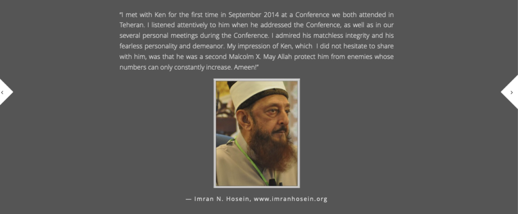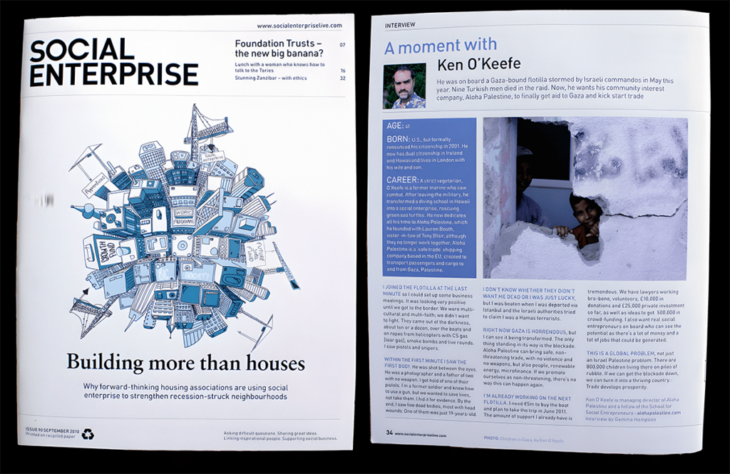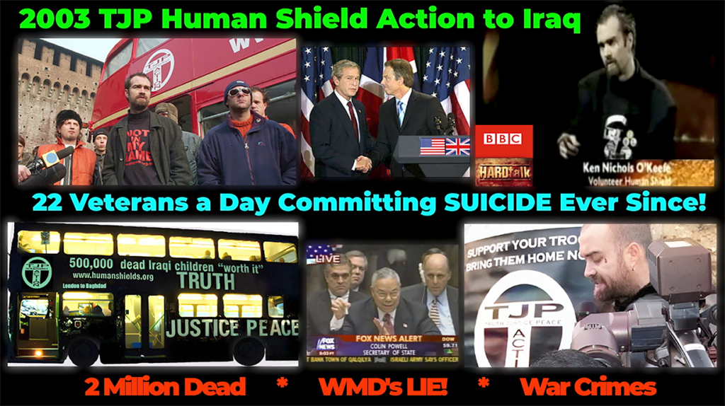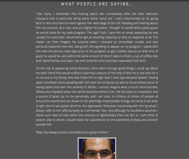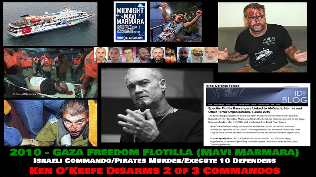 Anti-War: Ken O’Keefe issues a “Call to Action” in a “Mass-Migration to Iraq” to act as a “Human Shield” for Iraqi civilians” – Arguing that only a massive presence of Western citizens can stop the pre-planned invasion based on a false WMD Threat. His Strategy is based on International Law, specifically, the 4th Geneva Convention Protecting Civilians – An ‘Emergency Strategy Session’ is ordered by President George Bush in the Oval Office. (2002-2003)Ken lives & travels through the occupied West Bank in Palestine, leaving a message on the ‘Apartheid Wall’ & meeting with resistance factions Al Aqsa Martyrs Brigades, Islamic Jihad, the Palestinian Authority, Yasser Arafat & Mordechai Vanunu & more. He obtains uniform support for International Observers in Palestine. (2003-2009) Ken’s first successful entry into Gaza occurs when Captains one of two Boats from Cyprus to Gaza in 2008 and returned in 2011 by way of an extremely dangerous tunnel on after barely suviving the murder of 10 activists on the Mavi Marmara in which he disarms 2 of 3 Israeli Special Forces Commandoes in 2010. Israel declares him an ‘Operative of Hamas’ as does the US Congress in 2011.“My impression of Ken, which I did not hesitate to share with him, was that he was the second Malcolm X. May Allah protect him from enemies whose numbers can only constantly increase. Ameen”While the United States Demanded a ‘No Fly Zone’ over Iraq to supposedly protect civilian life, Ken calls for precisely the same while living and reporting from Gaza (2010-2011)Awarded ‘Key to the City of Gaza’ by Democratically Elected Prime Minister Ismail Haniyah (2011)