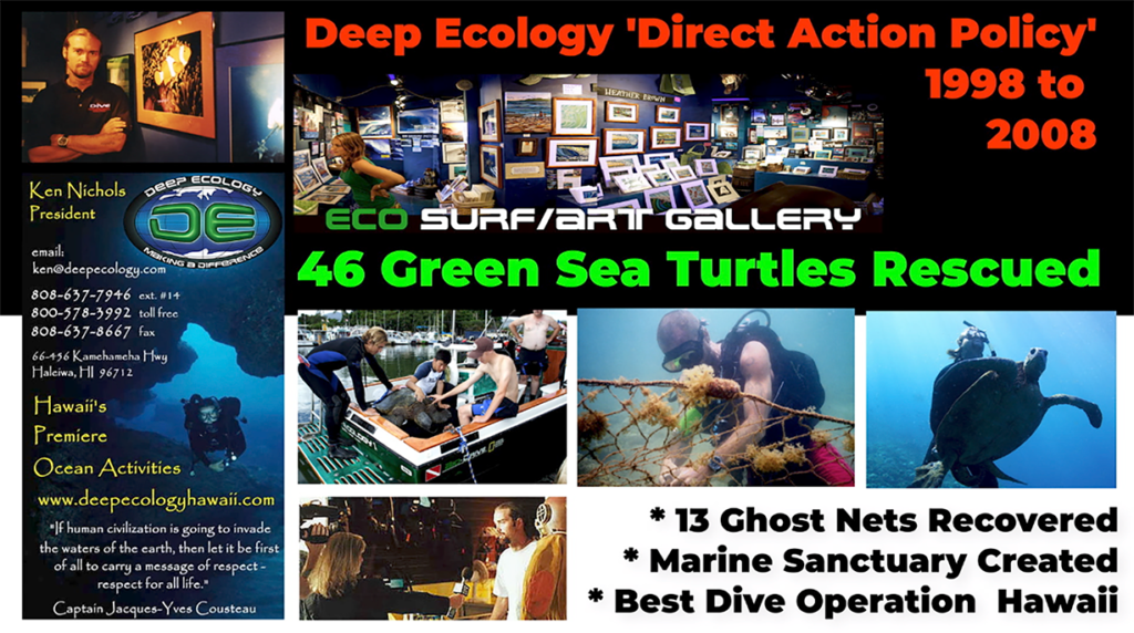 Deep Ecology Hawaii Mission Statement: To Provide Superior Service & Customer Satisfaction. To Protect & Defend the Marine Environment we operate within. (1999)Aloha Palestine/Samouni Project/Trade Not Aid – Ken creates his first Social Enterprises in Palestine/Gaza (2008)